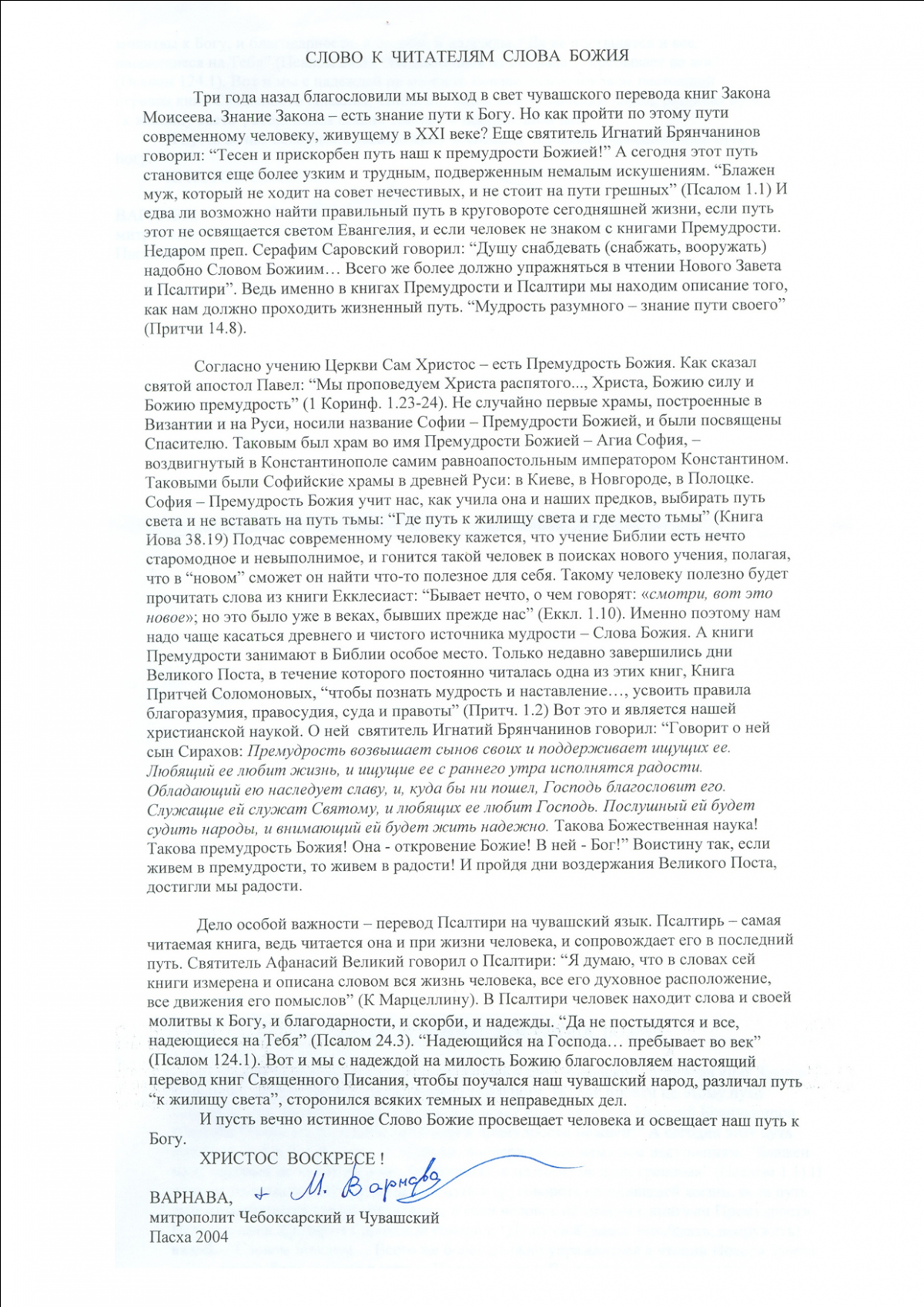Митрополит Чебоксарский и Чувашский Варнава поблагодарил всех, кто принимал участие в подготовке данного издания. Он отметил, что работа по переводу Священного Писания очень непростая, на этом пути могут быть неточности и ошибки, как и в русском синодальном переводе, и надо много потрудиться, чтобы их избежать.