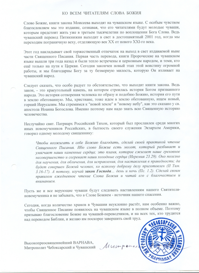 Митрополит Чебоксарский и Чувашский Варнава, обращаясь к присутствующим сказал, что для полноценной духовной жизни верующих очень важно иметь полный текст Священного Писания на родном языке. Он также отметил большой многолетний труд членов переводческой группы, работавшей в тесном контакте с чувашскими священниками, организационную, научную и финансовую поддержку РБО и ОБО.