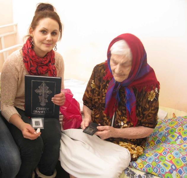 В течение ряда лет члены нашей церкви ХВЕП «Новый Завет» с. Орда Пермского края опекают пациентов Ашапского психоневрологического интерната «Дом старчества».В марте 2013 г. мы посетили своих подопечных и поздравили их с Днем защитника Отечества и Международным женским днем 8 Марта. Для пожилых людей в церкви были подготовлены подарки, которые мы вручали вместе с книгами, полученными из РБО. Это: Святое Евангелие, изданное крупным шрифтом, Новый Завет (Радостная Весть) в современном русском переводе, Новый Завет на аудио носителях.