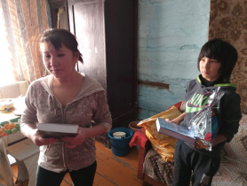 Днём мы поехали в деревню Бутрахты, которая находится в 8 км от села Таштып. Расположились в клубе, здесь было удобно разместить гуманитарную помощь и подарки. Весть о том, что приехали христиане, быстро разлетелась по округе. Поэтому почти все, кто был приглашён на встречу, скоро собрались. Пришедшие выбирали себе вещи, а затем с каждым из них мы общались индивидуально. Рассказывали им об Иисусе Христе, о Рождестве, с кем-то вместе помолились, а в конце беседы раздали подарки и Библии. В конце поездки мы зашли в дома тех людей, которые не пришли в клуб, чтобы поздравить и их с праздником Рождества.